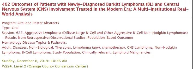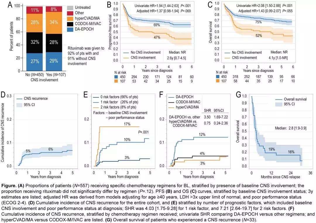 背景:Burkitt淋巴瘤(BL)极易出现中枢神经系统受累,需联合鞘内化疗或选用可透过血脑屏障(BBB)的药物全身化疗。目前低强度的DA-EPOCH-R方案在BL的治疗中展示了良好的生存(Dunleavy,NEJM,2013年),但该方案中并未包括用于预防中枢神经系统受累的药物(如大剂量甲氨蝶呤[HDMTX])。本项多中心回顾性临床研究旨在观察BL患者的治疗、风险因素及中枢神经系统受累相关结局。