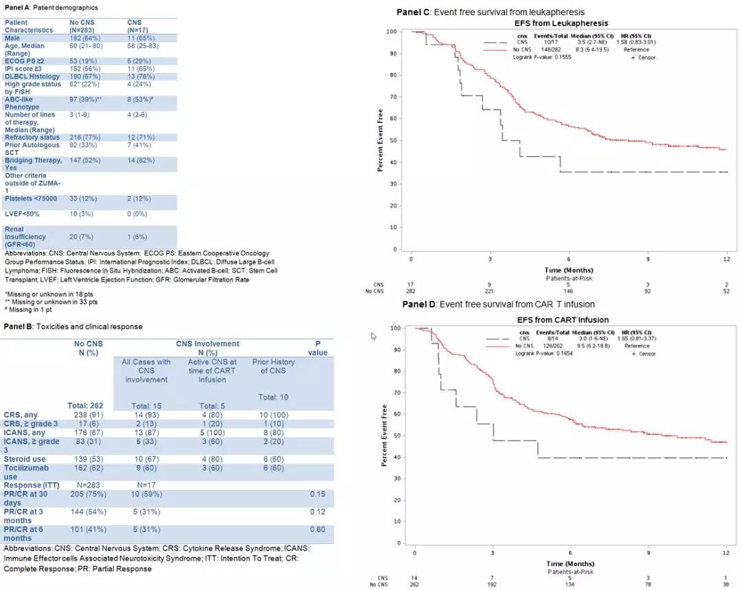 在接受白细胞清除后,中位随访时间10.1个月,中枢神经系统受累组和非中枢神经系统受累组患者接受意向性治疗最佳总有效率(CR+PR)分别为75%和59%,在第6个月时的持续缓解率分别为41%和31%(panel B)。在CAR-T细胞回输时仍有活动性中枢神经系统症状的5例患者中,最佳有效率为2例CR,1例PR,2例PD。在另10例CAR-T回输时中枢神经受累得到控制的患者中,目前已有两例患者出现PD,均为系统性复发。中枢神经系统受累与非中枢神经系统受累的患者。自白细胞清除后计算EFS,两组间无统计学差异(6个月EFS:CNS组36%,非-CNS组57%. HR=1.58, 95% CI:0.83-3.01, p=0.16, Panel C)。自CAR-T细胞回输计算6个月EFS,CNS组为49.9%(Panel D)。