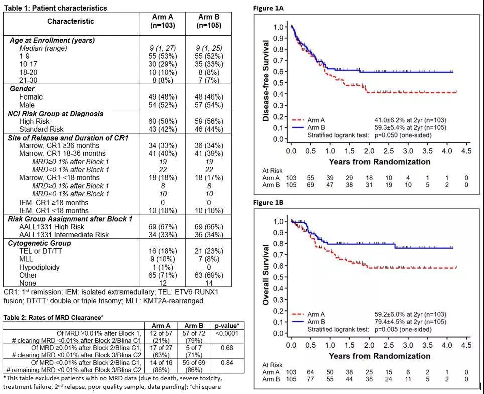 首要研究目的是比较纳入的1~30岁高/中危首次复发B-ALL患者的无病生存期(DFS)。所有患者接受再诱导化疗(Block 1,UKALLR3/米托蒽醌组)后随机分为两组:或是接受2周期强化化疗(Block 2/3,UKALLR3;对照组A);或是接受2周期4周的兰妥莫单抗治疗,每周期后停药一周(Blina 1/2周期;试验组B)。Block 1治疗后骨髓原始细胞≥25%的患者不进行随机分组。随机分组治疗后,两组患者均进行allo-HSCT。