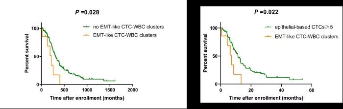 结果:纳入的134名晚期乳腺癌患者中位年龄为 51岁,其中119例 (88.8%) 为激素受体阳性的患者。中位无进展生存期(progression-free survival ,PFS) 9.9 月(95% CI, 8.1~11.6 月)。116 (86.6%) 名患者接受一线化疗前可检测到CTC。其中9名患者可检测到CTC-WBC 团,而7名患者可检测到混合型或间质型CTC-WBC 团(即EMT样CTC-WBC 团)。基线检测到EMT样CTC-WBC 团的患者PFS较未检测到的患者明显缩短 (7.2 vs 10.4 月, P=0.028)。与基线检测到大于等于5个含上皮型成分的CTC相比(包括上皮型CTC和混合型CTC),检测到EMT样CTC-WBC 团的患者PFS也明显缩短( 7.2 vs 11.4 月, P=0.022)。