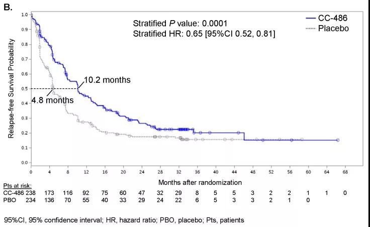 中位随访时间为41.2个月,结果显示:①与安慰剂组相比,CC-486组患者的总体生存(OS)得到显着改善,其中位OS分别为24.7个月和14.8个月(HR 0.69 [95%CI :0.55~0.86],P=0.0009)(详见图A)。②在无复发生存(RFS)方面,CC-486组也明显占优,中位RFS分别为为10.2个月(CC-486组)及4.8个月(安慰剂组)(HR 0.65 [95%CI:0.52~0.81],P=0.0001)(详见图B)。③无论患者的细胞遗传学分层、既往接受过的巩固治疗次数以及CR/CRi状态如何,CC-486均能带来OS和RFS获益。④在健康相关的生活质量(HRQoL)方面,CC-486对HRQoL并无不利影响,与安慰剂组对比无差异。⑤在安全性方面,CC-486组和安慰剂组最常见的不良事件(AEs)为1~2级胃肠道不良反应,包括恶心(CC-486组64%,安慰剂组为23%)、呕吐(CC-486组为59%,安慰剂组为10%)和腹泻(CC-486组 49%,安慰剂组为21%)。最常见的3~4级AEs包括中性粒细胞减少症(CC-486组41%;安慰剂组24%)、血小板减少症(CC-486组23%,安慰剂组22%)和贫血(CC-486组14%和,安慰剂组13%)。严重的AEs不常见,很少因AEs导致治疗中断。