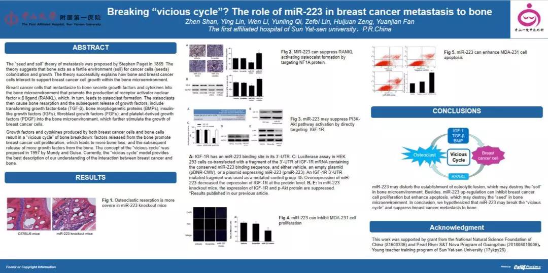 编者按:晚期乳腺癌患者常见骨转移,目前临床治疗和预防手段仍十分有限;骨微环境中破骨细胞与肿瘤细胞之间的相互作用构成了肿瘤骨转移发生发展的恶性循环(Vicious Cycle)。在中山大学附属第一医院乳腺外科林颖教授团队入选2019年SABCS大会交流的一项研究(摘要号:P1-05-11)中,系统阐释了乳腺癌骨转移的“Vicious Cycle”机制,为临床转化应用提供基础。