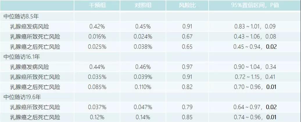 始于1991年的女性健康倡议(WHI)是全世界规模最大、随访时间最长的疾病预防研究之一,该研究共入组了超过16万例绝经后女性,研究总预算高达6.25亿美元,包括3项随机对照干预研究和1项观察研究。近日,JCO报道了其中一项饮食改善研究(WHI DM),入组了来自全美40个中心的4 8835例绝经后女性,这些入组的女性年龄介于50~79岁、无乳腺癌史、饮食脂肪摄入量占总能量≥32%,按3:2的比例被随机分为常规饮食组(n=2 9294)和饮食干预组(n=1 9541)。饮食干预目标为脂肪摄入量减少至占总能量的20%,同时增加蔬菜、水果和谷物的摄入量。通过集中复核医疗记录,确认随访期间新发生的乳腺癌。通过查询全国死亡登记数据库,计算死亡风险。主要结果见下表。