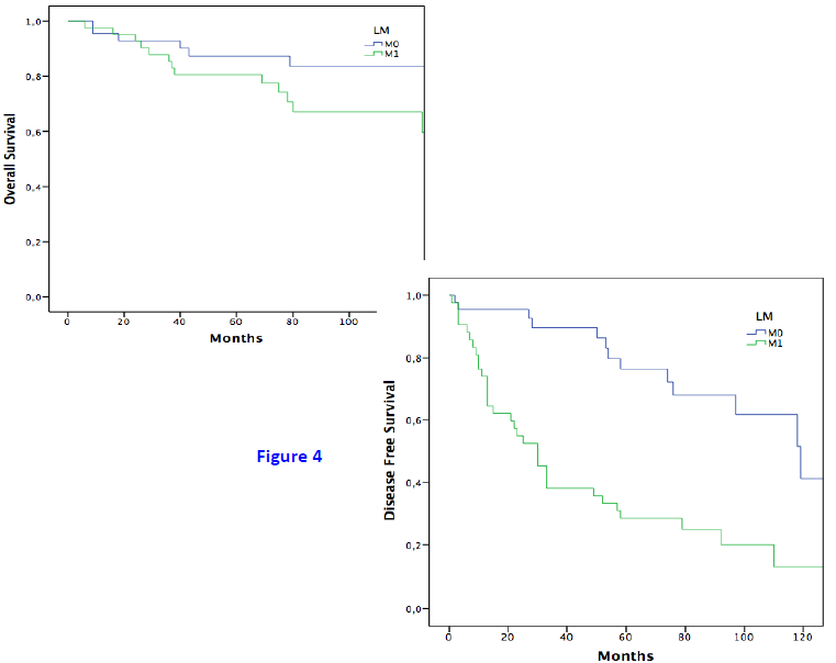 另外还有一项关于胰腺部位肿瘤大小与肝转移的研究也比较有意义。该单中心研究比较不同大小pNENs(≤ 2cm和> 2cm)与自然病程的OS和DFS以及特定预后因素与肝转移(LM)的风险之间的关系。共计87例患者纳入分析,有LM的患者42例(48.2%),无LM的患者45例(51.7%)。所有患者都接受了原发肿瘤的根治性手术。在单变量分析中,原发肿瘤直径(> 2cm)是唯一LM发生的相关因素 (p<0.04), 多变量分析也证实了这一发现 (p=0.032)。Cross-Tabs评估显示,>2 cm pNENs患者发生LM的可能性是肿瘤较小患者的4倍。5年和10年OS分别为M0组87.4%和83.6%,M1组为80.6%和67.2% (p=0.18)。5和10年DFS 在M0组为76.2%和41.1%,  在M1组28.6%和13.3% (p<0.0001)(图7,8)。该研究证实,尽管肿瘤生物学预测目前仍然缺失,肿瘤直径是唯一的发生LM风险独立因素[8]。