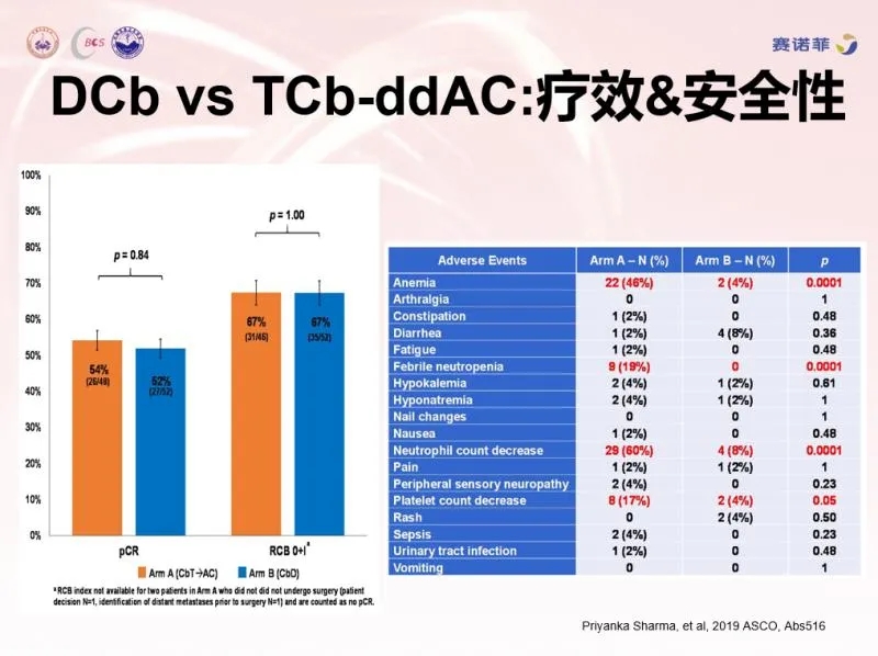 背景:Ⅱ期NeoStop研究显示,TNBC新辅助DCb(无蒽环) vs. TCb-ddAC(含蒽环)的病理完全缓解(pCR)率和残留癌症负荷率(RCB 0-1)率相当,但含蒽环不良反应更高。