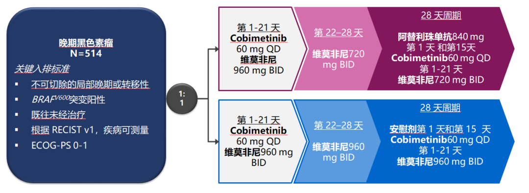 设计:IMspire150研究(III期)入组了514例晚期BRAF-V600突变的黑色素瘤患者,随机分成V+C+A和V+C+P(V:维莫非尼,C:考比替尼,A:阿替利珠单抗,P:安慰剂),前4周为靶向导入期,4周后加入A或者P,V较常规剂量有所减量(见下图)。研究终点为PFS。