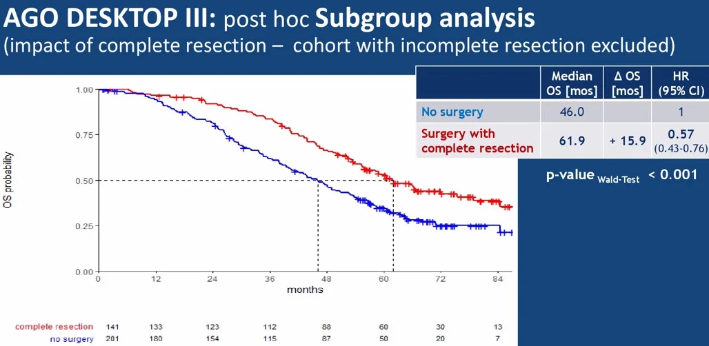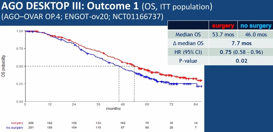 2020 年ASCO年会编号6000的口头报告公布了AGO DESKTOP III/ENGOTov20试验的最终研究结果,也是大家拭目以待的研究,与前期中期数据分析报道的不同是得到了OS和TFST的数据。研究结果显示:相比单纯含铂联合化疗组,二次减瘤术联合含铂联合化疗组患者的OS、PFS和TFST均获益。同时研究发现手术+联合化疗组的死亡率和并发症不增加,研究还发现患者获益的关键在于“手术完全切除”,二次减瘤术有残留病灶,患者不能从中获益,甚至比单纯化疗更差。