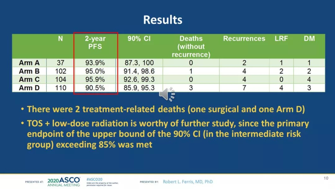 背景:ECOG-ACRIN 3311是一项关于“中度风险” p16 +口咽癌(OPC)患者接受主要经口外科手术治疗后,减少术后治疗手段的研究。本研究主要观察终点是随机分组接受50 Gy和60 Gy放疗,而未经化疗患者的2年无进展生存期(PFS)。