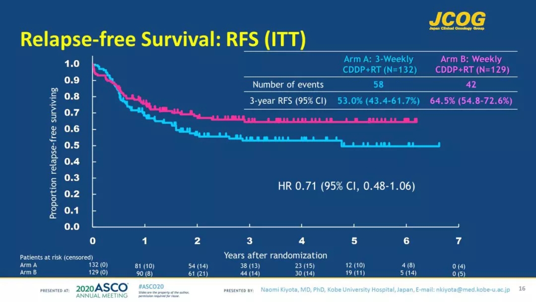 结果:2012年10月至2018年12月,共入组261例患者(A组132例,B组129例)。在计划进行的第三阶段中进行第二次中期分析,共有76/161个事件,数据和安全监视委员会建议终止试验并发布结果,因OS非劣效性的统计范围已达到预先指定的停止标准。所有随机分组患者的中位随访时间均为2.2年,A组的3年OS为59.1%,B组为71.6%,HR为0.69(99.1%CI:0.374~1.273 [<1.32],非劣效性的单侧P=0.00272 <0.00433)(图3)。A组的3年RFS为53.0%,B组为64.5%,HR为0.71(95%CI:0.48~1.06)(图4)。关于急性不良事件,A组中性粒细胞减少症(≥3级)、肌酐升高(≥2级)、听力障碍(≥2级)和粘膜炎(≥2级)的发生率分别为48.8%、8.5%、7.8%和55.0% B组分别为35.3%、5.7%、2.5%和59.0%。为了更好的依从性,A组的CDDP中位总剂量为280 mg/m2(IQR:250~299),B组为239 mg/m2(IQR:199~277)。两组总放射治疗剂量均为66 Gy(IQR:66~66)。A组中治疗完成的比例为93.2%,B组中为86.8%。