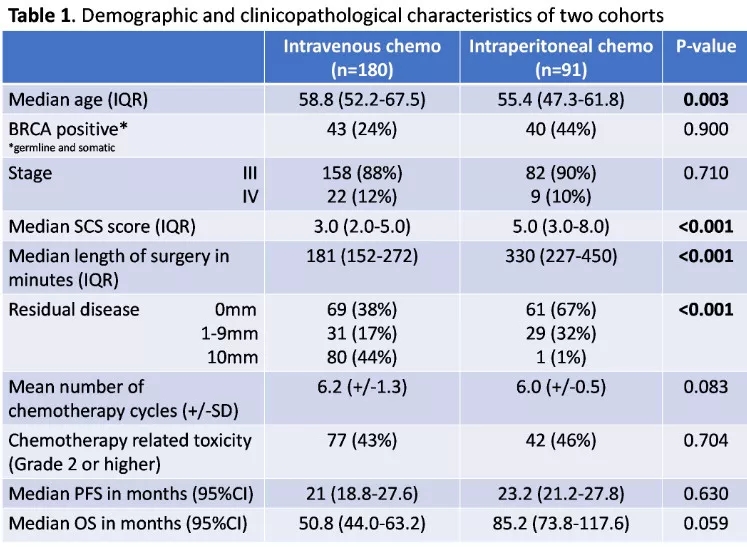研究得出结论:与常规静脉化疗相比,腹腔内化疗有提高生存率的趋势,尤其是在无残留病灶的晚期卵巢癌患者中。在单变量和多变量模型中对显著的协变量进行调整后,IP化疗不再是OS或PFS的预测因素,尽管IP化疗组仍有获益趋势,化疗相关毒性的发生率在两个队列中相似。考虑到本研究属于回顾性分析,且样本量较小,开展前瞻性的非随机队列研究,评估腹腔内化疗在晚期卵巢癌患者中的作用很有必要。