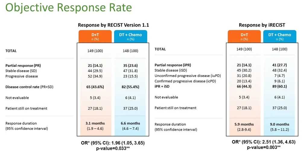 结果:中位随访时间16.6个月,DT+CT组对比DT组OS没有统计学差异(16.6月 vs. 14.1月,HR=0.88,p=0.46)。DT+CT组的中位PFS显著延长(7.7 月vs. 3.2月,p=0.0035, HR=0.67)。DT+CT组基于iRECIST 标准评估的ORR高于DT组(27.7% vs. 14.1%, p=0.001)。