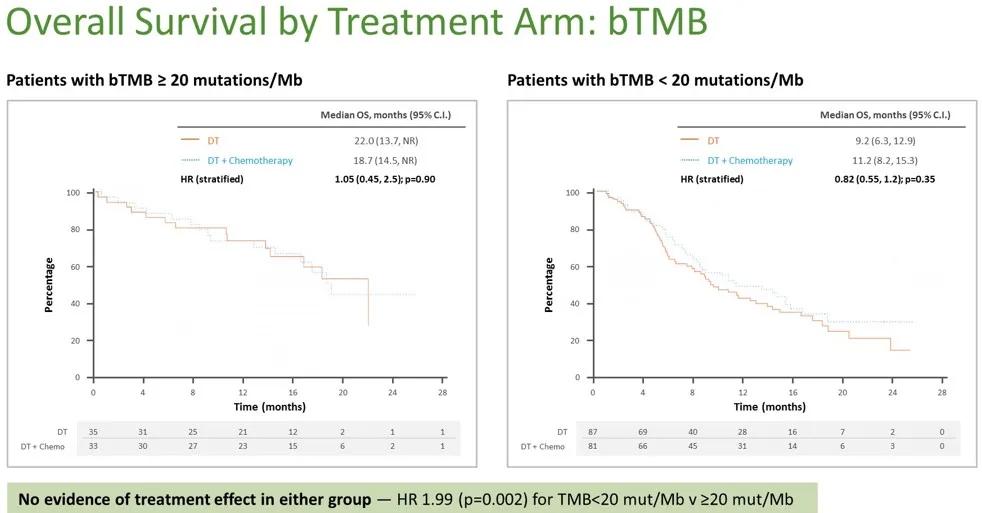 在本次ASCO上首次报道了CheckMate 9LA短程化疗(2个周期)联合双免疫对比标准化疗在未筛选人群中取得了OS(15.6 vs. 10.9个月)及PFS(6.7 vs. 5.0个月)的双重获益。该研究证实了双免疫联合化疗在晚期NSCLC一线治疗中的优势及可行性。CCTG BR.34也是一项双免疫联合化疗的尝试,入组IVA(高风险)*或者IVB患者,两者入组比例分别为30%和70%。并选择了分期、病理类型及吸烟状态为预分层因素。从结果来看,BR34研究中DT+CT获得了ORR及PFS的显著提高(ORR提高),而OS仅延长了2.5个月,并未达到统计学差异(16.6月 vs. 14.1月,p=0.46)。相比于PD-1抑制剂的研究的阳性结果,DT+CT未达到比DT更优的OS获益。