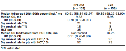 本研究表明,CPX-351可显著改善新诊断高危AML或继发性AML患者的生存。