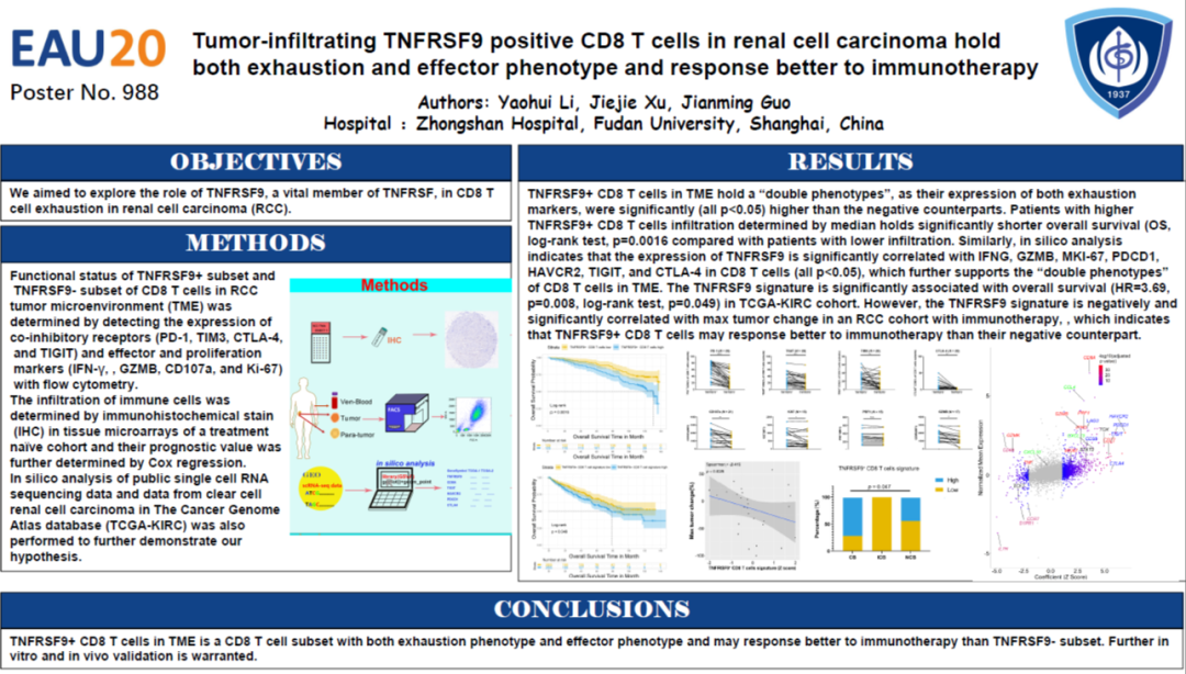 编者按:受疫情影响,2020年欧洲泌尿外科协会年会以视频会议+主题周的形式于2020年7月17日~7月19日、2020年7月20日~7月26日在线举行。复旦大学附属中山医院郭剑明教授团队的李耀辉教授在肾癌创新与转化研究分会场(Poster Session 71 - Innovations in translational research in renal cancer)汇报了近期的研究成果(摘要号:988 ;题目:Tumor-infiltrating TNFRSF9 positive CD8 T cells in renal cell carcinoma hold both exhaustion and effector phenotype and response better to immunotherapy)。该研究揭示了肾癌组织浸润的TNFRSF9+ CD8+ T 细胞亚群的功能状态及这群细胞可能在免疫治疗反应中扮演重要角色。