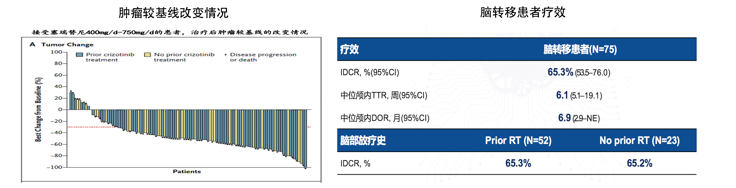 在75例脑转移患者中,塞瑞替尼颅内病灶控制率(iDCR)达65.3%,中位颅内应答时间(TTR)为6.1周,中位颅内应答持续时间(iDOR)为6.9月。对于前期接受过脑部放疗的患者,iDCR为65.3%,对于前期没有接受过放疗的患者,iDCR为65.2%,可见前期放疗不会影响塞瑞替尼的疗效。