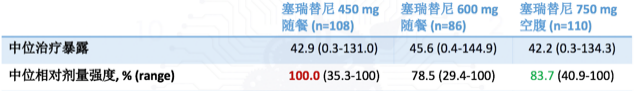 450 mg随餐组的中位相对剂量强度最高(100% vs 78.5% vs 83.7%)、大于1剂药物减量的患者比例最低(4.6% vs 31.4% vs 34.5%)