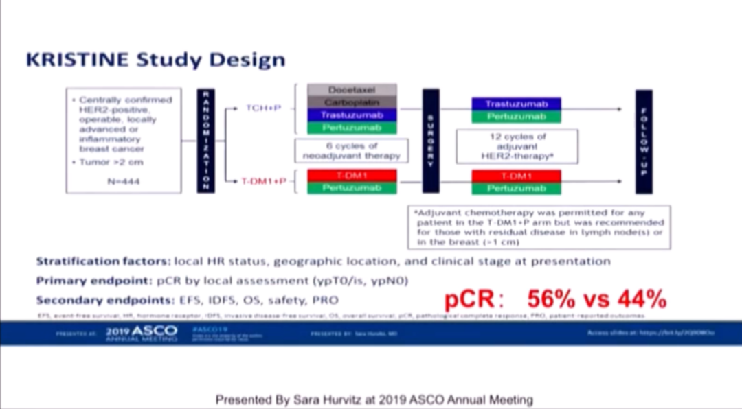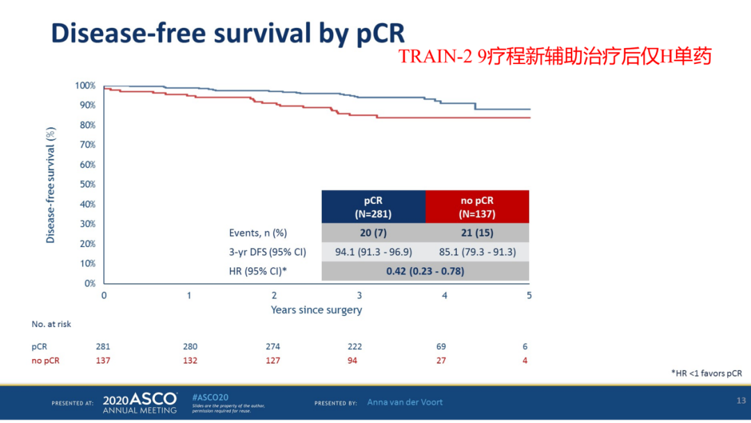 KRISTINE研究作为第一个在HER2阳性乳腺癌患者治疗中全程应用双靶的研究,随访37个月的研究结果显示,TCH+P方案对比T-DM1+P方案有更高的pCR率,且TCH+P方案与T-DM1+P方案中获得pCR患者的IDFS可分别达97.5%和 96.7%。而TRAIN-2研究中,研究组在接受9周的TCbHP方案后仅用曲妥珠单抗进行辅助治疗,结果显示,新辅助治疗达到pCR的人群中,3年DFS率为94.1%。因此,新辅助治疗后达到pCR的患者值得去进一步讨论降阶梯治疗吗?