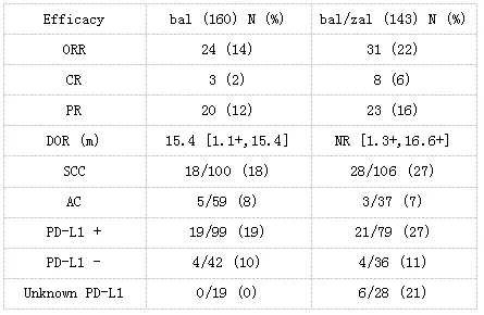 bal单药组161例患者,bal +zal联合治疗组155例,其中两组分别有160例和143例有基线的可评估病灶。所有患者既往均接受过铂类为基础的一线治疗。纳入病例的组织学类型主要为鳞状细胞癌(bal组占63%;bal/zal组占74%),其他的还包括腺癌、腺鳞癌及其他癌。PD-L1阳性定义为CPS≥1%(62%bal; 55%bal/zal),阴性定义为CPS <1%(26%bal; 25%bal/zal)或未知(12%bal; 20%bal/zal)。治疗有效性见下表。