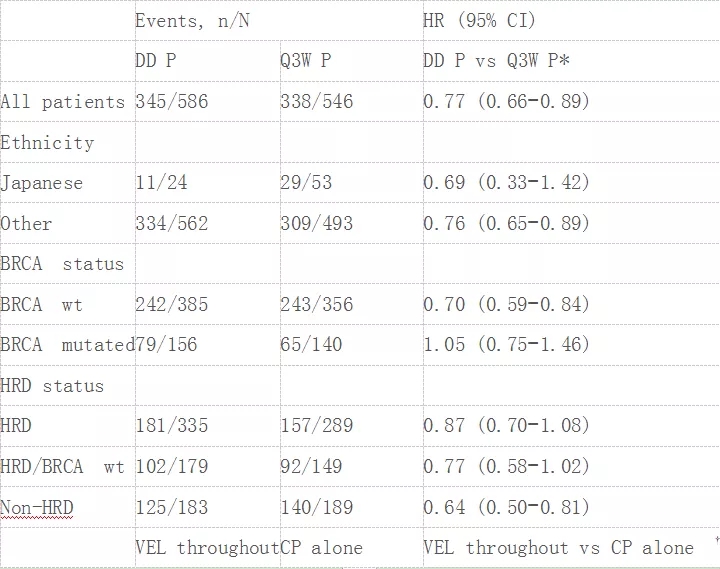 在这项探索性分析中,在新诊断的高级别卵巢浆液癌患者中,无论是总体人群还是生物标志物阴性的亚组,DD P(+/- VEL)方案均显示出较长的PFS获益,但同时对比Q3W P,也表现出更常见的3/4级血液毒性。