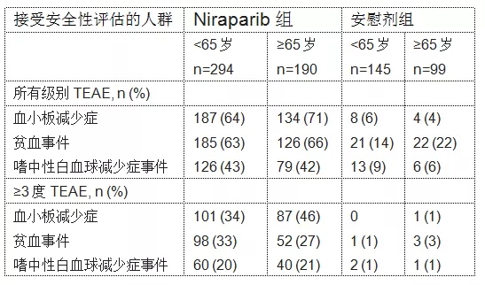 本实验共招募了733例患者,有444名<65岁(尼拉帕尼组297例,PBO组147例),有289名≥65岁(尼拉帕尼组190例,PBO组99例)。在年龄<65岁(HR=0.61; 95%CI: 0.47–0.81)和≥65岁(HR=0.53; 95%CI: 0.39–0.74)的患者中,接受尼拉帕尼治疗与接受PBO治疗的有效性相当。在各个年龄段中,任何等级和≥3级治疗相关不良事件发生率相似(见下表)。在年龄<65岁组中,接受FSD和ISD的患者中分别有≥43%和18%的发生≥3级血小板减少事件。在年龄≥65岁的患者中,该数值分别为57%和26%。通过FOSI和EQ-5D-5L评估,两个年龄组患者的结局指标(PROs)和生活质量(QOL)相似。