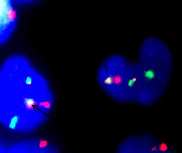 图2:FISH:原始细胞、粒细胞、单核细胞、红细胞、巨核细胞均有BCR/ABL 阳性