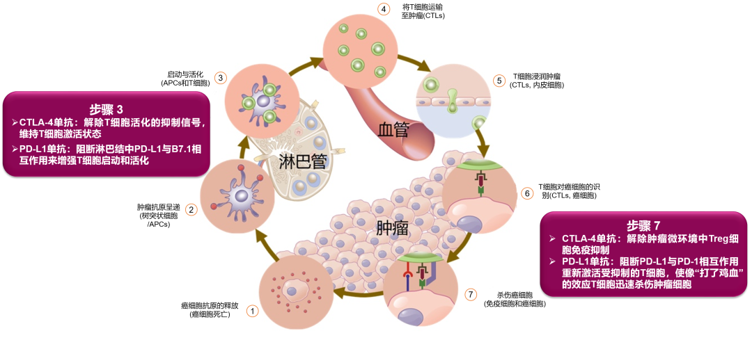 在T细胞激活阶段(图1步骤3),CTLA-4单抗与PD-L1单抗各司其职,其中CTLA-4单抗能够通过解除抑制T细胞活化的信号,从而维持T细胞激活状态。而PD-L1单抗则通过阻断淋巴结中PD-L1与B7-1分子的相互作用,来增强 T细胞启动与活化。