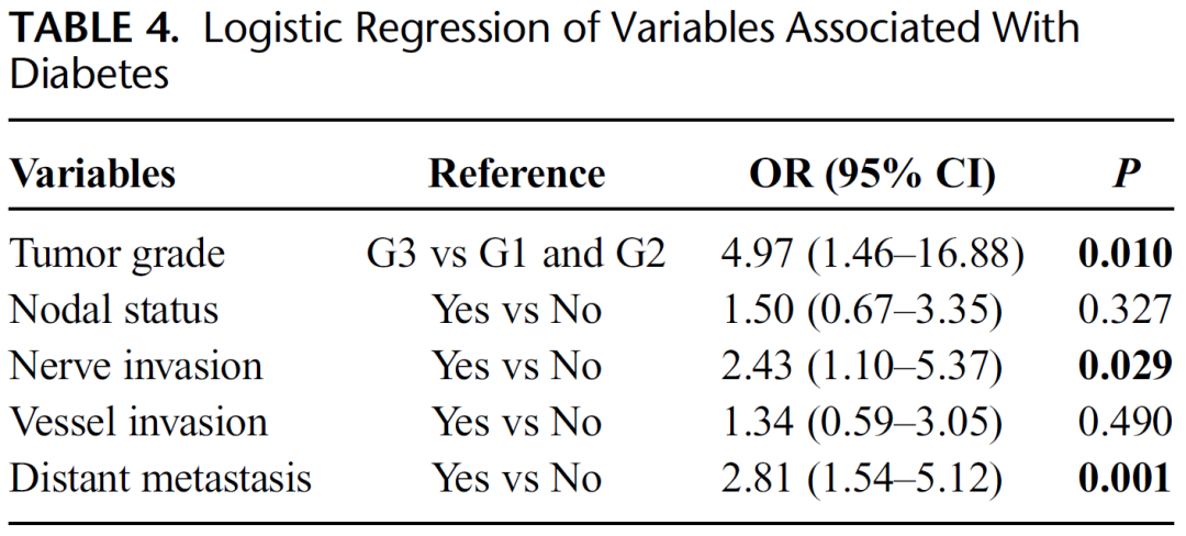 该队列中T2DM的患病率为20.7%(n=62)。合并T2DM的pNET患者出现G3级肿瘤、远处转移和神经侵犯的比例高于非T2DM患者,因此,T2DM患者的生存率更差。在校正肿瘤分期后的单因素分析中,糖尿病状态与不良生存无关。logistic回归分析结果显示,pNET合并T2DM的患者发生肿瘤转移(优势比[OR]为2.81;P=0.001)、神经侵犯(OR,2.43;P=0.029)和G3级肿瘤(OR,4.97;P=0.010)的风险较高。