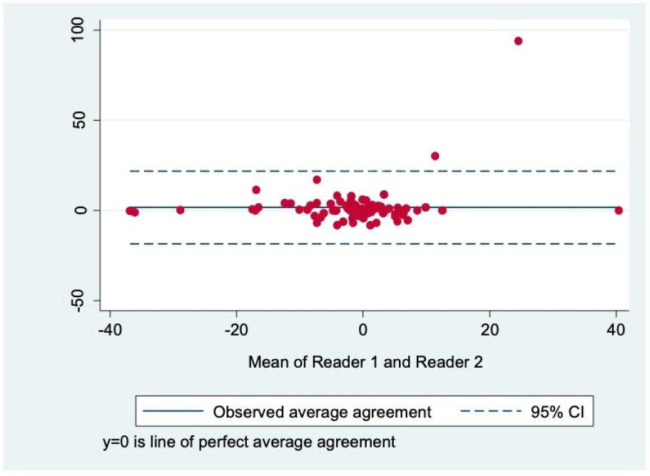 Bland Altman图适用于所有阅片者(a)放射科医生vs放射科医生;(b)放射科医生vs肿瘤学家(c)。所有阅片者(759次观察)中,Lin的相关系数(LCC)为0.52(95%CI为0.38-0.65),Kappa(KC)为0.57,一致性为81.55%。放射科医生vs放射科医生(437次观察):LCC为0.08(95%CI为0.15-0.30),KC为0.60,一致性为81.67%。放射科医生vs肿瘤学家(322次观察值):LCC为0.85(95%CI为0.78-0.94),KC为0.51,一致性为81.40%