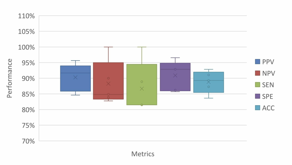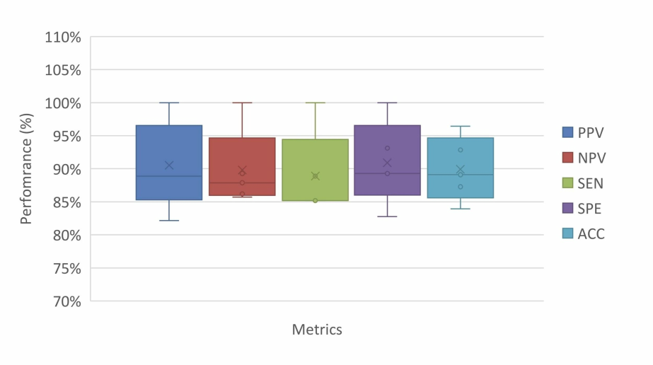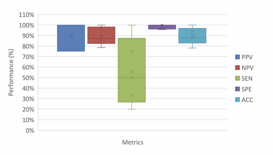 图2. A-C:包括所有患者在内的5倍交叉验证中随机森林模型的性能(PPV、NVP、SEN、SPE和ACC)的箱形图,92种血浆蛋白生物标志物与CgA-log(模型1,(A));包括所有患者和12个最常见的生物标志物(B);包括对照组和低CgA(≤ULN)的SI-NETs患者,92个生物标志物,不包括CgA-log(模型2,(C))。