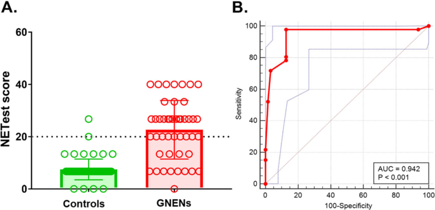 A. GNENs(23±11;n=46)中NETest测量值显著高于对照组(7±4,p<0.0001;n=63)。平均值±标准差。虚线:NETest的正常值上限(20%)。B. GNENs和对照组中NETest水平的AUROC:区分GNENs和对照组的AUROC(红线)为0.94(95%CI:0.88至0.98,p<0.0001)。最大AUC = 1可理想(完美)区别疾病和非疾病受试者。对角线(AUC= 0.5)对应于辨别力概率。NETest AUC>0.9(红线)表明它是GNEN的优良生物标志物