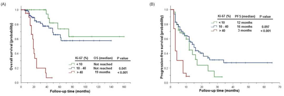 图4. 在整个研究队列中根据Ki-67指数分层的Kaplan-Meier曲线:(A)总生存期,(B)无进展生存期