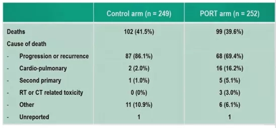 第四,PORT还会增加额外的治疗毒性。PORT组有更高的3-4级毒副反应发生率,PORT组有更多的人死于心肺并发症(2.0% vs 16.2%),这会把一部分PORT的获益抵消。