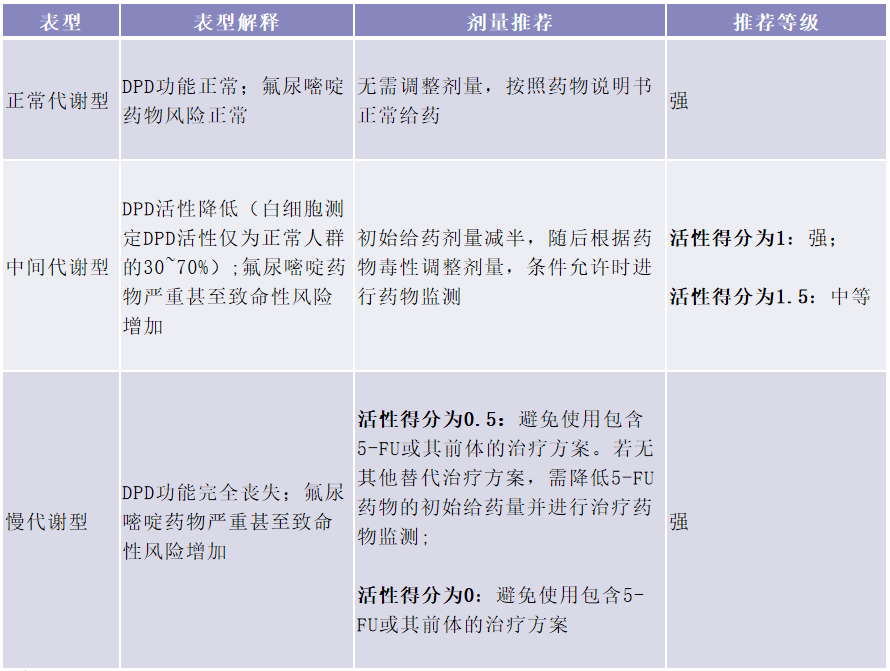 表1. CPIC根据DPD表型的氟尿嘧啶用药推荐