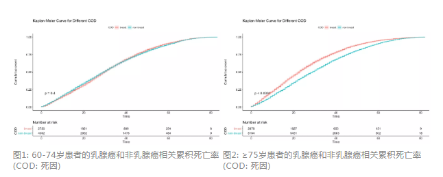 老年组的乳腺癌与非乳腺癌相关累积死亡率无显著差异(HR=0.98, 95% CI: 0.93-1.03, P=0.4);而高龄组的差异有统计学意义(HR=0.77, 95% CI: 0.73-0.799, P<0.0001)。老年组的非乳腺癌相关死亡原因主要为心脏疾病(12.1%)、慢性阻塞性肺病(COPD)及相关疾病(4.8%);高龄组为心脏疾病(20.43%)和脑血管疾病(5.4%)。