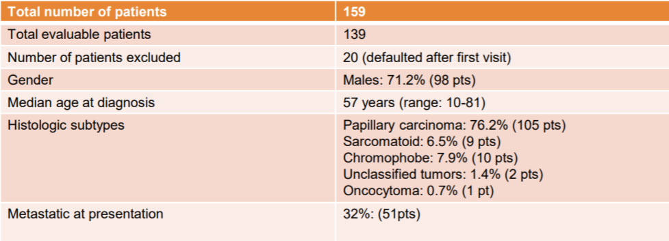 因此,晚期非透明细胞癌的治疗困境逐渐凸显,整体治疗疗效差,严重影响晚期肾癌的整体生存率。由于种类繁多,小众人群,相关临床研究很少。复旦大学附属肿瘤医院目前晚期肾癌数据库病例接近1000例,我们正在总结相关的数据,这里我们拟结合今年ESMO Asia会议中印度报道的非透明肾细胞癌的临床研究数据与大家一起分享。