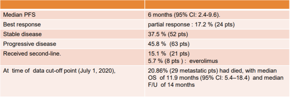 所有患者的平均PFS为6个月(95%可信区间:2.4~9.6)。其中部分缓解16.6%,稳定期37.5%,进展期45.8%。仅有21例(43.8%)能接受二线治疗,其中以依维莫司最为常用(38%)。在数据截止点(2020年7月1日)时,已有29名转移患者死亡,平均总生存率为11.9个月(95%可信区间:5.4~18.4),平均随访时间为14个月。
