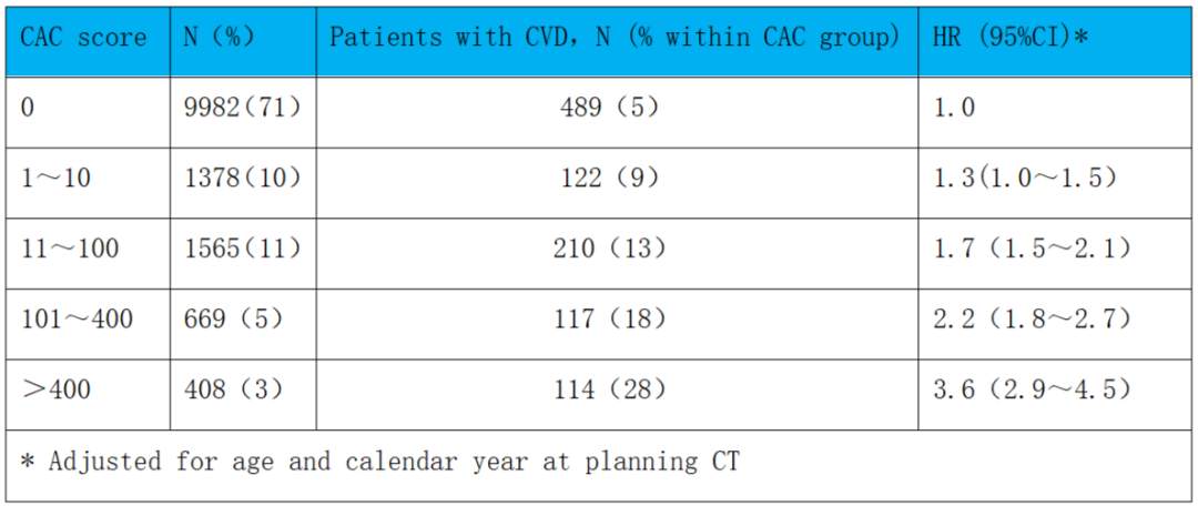 该研究共纳入14002例患者资料,平均年龄58岁(SD=11)。29%的患者CAC评分为0(见表)。平均随访52个月(IQR:27~82),8%的患者(n=1138)因CVD入院,93例患者(1%)死于CVD。在计划CT中对年龄和日历年进行调整后,CAC越高,CVD风险越高,从无CAC患者的5%增加到CAC评分为400患者的28%。在接受蒽环类药物治疗的患者中,高CAC评分与CVD的相关性最强(HRCAC>400:5.4,95%CI:2.6~11.3)。