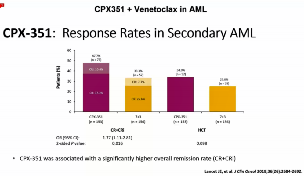 研究背景:CPX-351已获批用于治疗既往骨髓增生异常综合征(MDS)引起的治疗相关AML或继发性AML(s-AML)患者。与7 + 3相比,CPX-351在s-AML患者中表现出更高的缓解率(ORR)、更好的耐受性和更好的生存期(OS)。