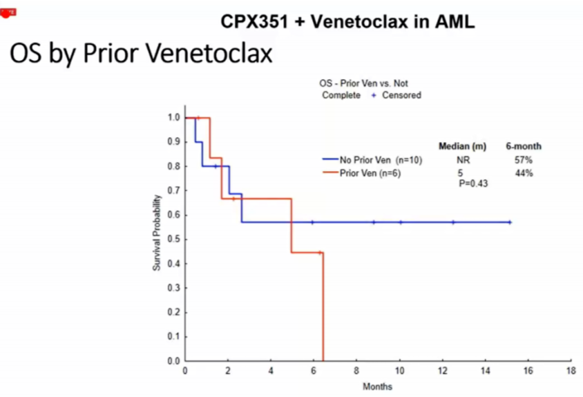 研究结论:对于复发、难治性AML患者中,CPX-351加7天维奈托克可耐受,毒性可接受。在该高风险AML队列中,CPX联合维奈托克表现出令人鼓舞的活性,尤其是在既往未接受维奈托克的患者中。几乎所有应答者均能够继续接受SCT。