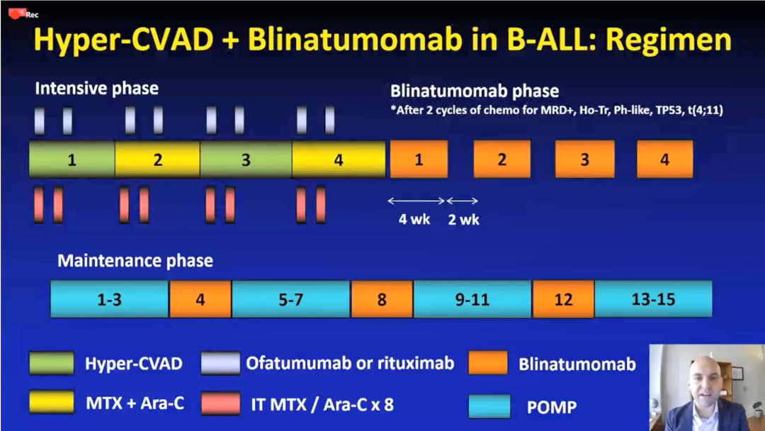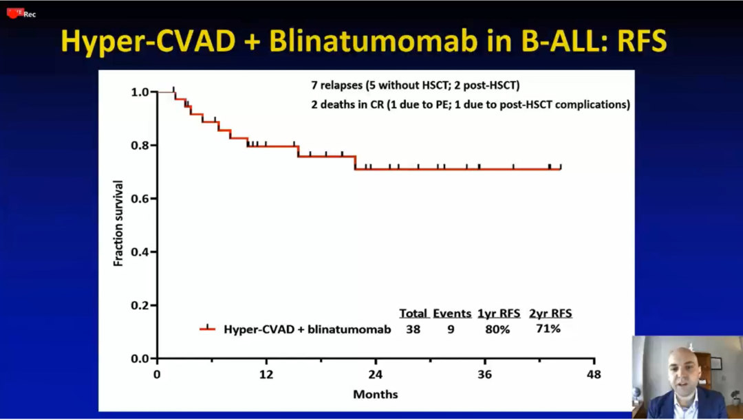 高剂量CVA与blinatumomab序贯联合治疗作为Ph- B细胞ALL患者的一线治疗前景广阔,CR率是100%,97%的患者实现MRD阴性。生存数据很有前景,估计2年OS为86%。