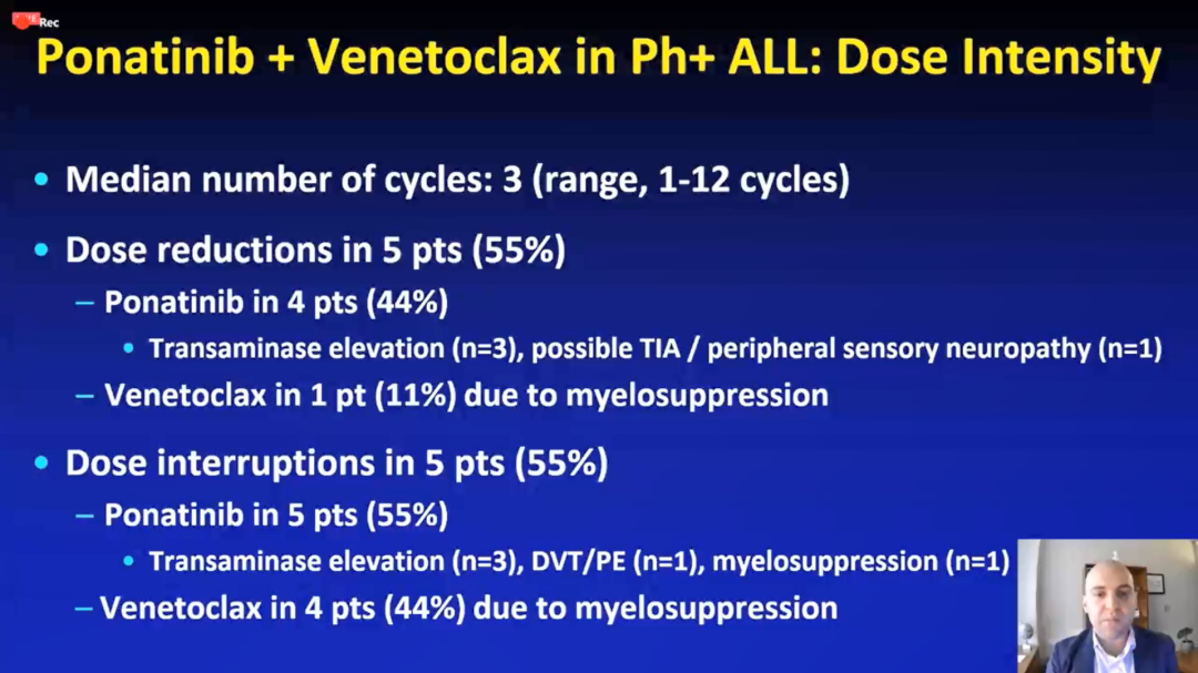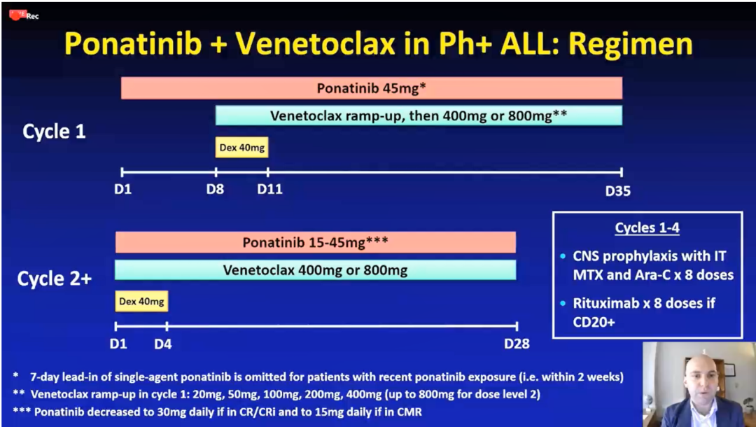 纳入标准为≥18岁既往接受过至少1种BCR-ABL TKI的R/R Ph + ALL或淋巴母细胞期慢性髓性白血病成人患者有资格参加研究。对于第1周期,没有近期普纳替尼暴露(即2周内)的患者接受为期7天的普纳替尼单药治疗导入,其中在第1天至第35天每天给予45 mg的普纳替尼,在第8天至第35天每天给予维奈克拉(在剂量水平1中最高400 mg;在剂量水平2中最高800 mg),并在第8天至第11天每天静脉注射/口服40 mg地塞米松。近期暴露于普纳替尼的患者从第1周期的第1天开始接受所有三种药物。对于第2 + 周期,所有患者在第1-28天每天接受维纳托克400-800 mg,在第1-28天每天接受普纳替尼,在第1-4天每天接受地塞米松40 mg IV/PO。普纳替尼的剂量根据缓解状态进行调整。未达到CR/CRi的患者接受45 mg/天治疗,达到CR/CRi但通过PCR仍可检测到BCR-ABL1的患者接受30 mg/天治疗,达到完全分子学缓解(CMR)的患者接受15 mg/天治疗。每个周期为28天。所有患者均接受了8次鞘内化疗。针对CD20 + 疾病,最多加用8剂利妥昔单抗。主要安全性目的是确定venetoclax联合帕纳替尼和地塞米松的最大耐受剂量(MTD),主要疗效目的是确定方案的CR/CRi率。