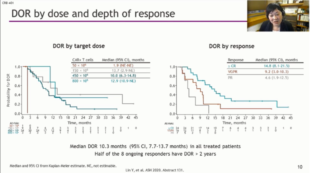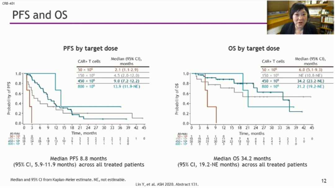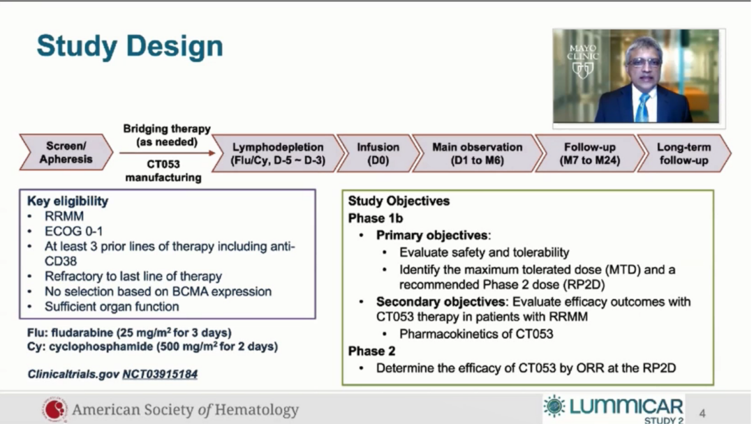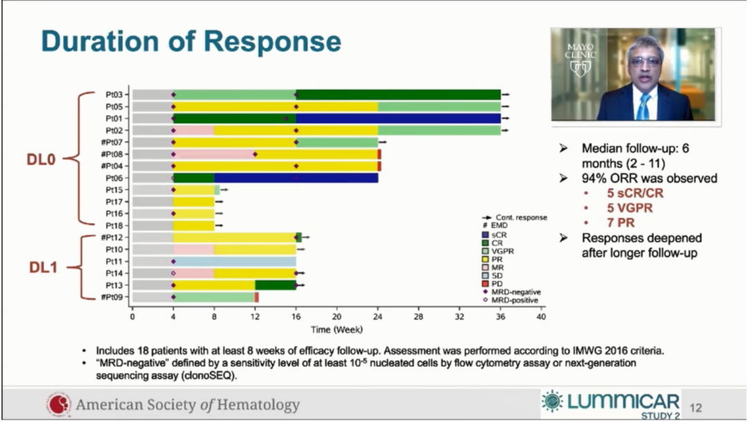 Kumar教授:该研究是一项1b/2期的临床试验,CT053是 CARsgen公司研发的一种靶向BCMA的CAR-T产品,本次ASH大会上有两项研究更新了CT053的研究数据,一项是在中国开展的 LUMMICAR-1研究(n=24),另一项则为美国开展的 LUMMICAR-2研究(n=20),这两项研究中CT053的总体缓解率(ORR)均达到了80%~90%。在 LUMMICAR-2研究中,18例患者可进行疗效评估,其中17例患者获得了治疗反应,10例达到了非常好的部分缓解(VGPR)以上的疗效,14例达到了微小残留病(MRD)阴性,截止目前,其疗效非常良好。在2期研究阶段,计划应用250~300×106/L CAR-T细胞进行治疗。在毒副作用方面,大部分患者出现了1-2级CRS,有1例患者发生了3级神经学毒性,但是总体上而言,其毒副作用均较容易处理。大部分的毒副作用为淋巴细胞衰减的血细胞减少,另外也有部分患者出现了迟发性血小板减少和中性粒细胞减少,我们认为这与CAR-T治疗本身有相关性。