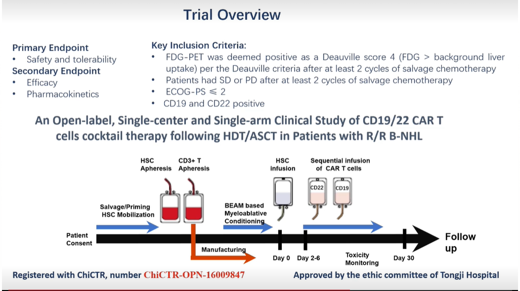我们进行了一项开放标签、单中心、以及在自体造血干细胞移植(HSCT)后序贯输注CD22和CD19 CAR-T细胞的治疗的单组初探性研究。旨在评价挽救治疗后疾病残留或进展的R/R B细胞淋巴瘤患者治疗的安全性和疗效。