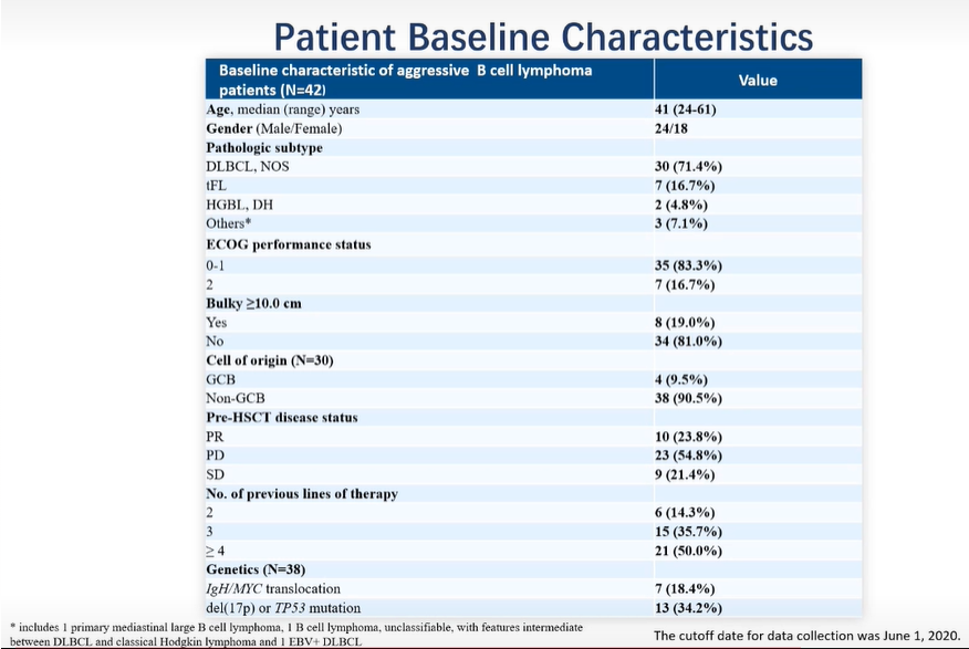 2016年11月14日至2019年8月15日期间,共纳入42例患者接受了BEAM方案预处理后的自体造血干细胞移植(HSCT),随后接受了CAR 19/22 T细胞输注。