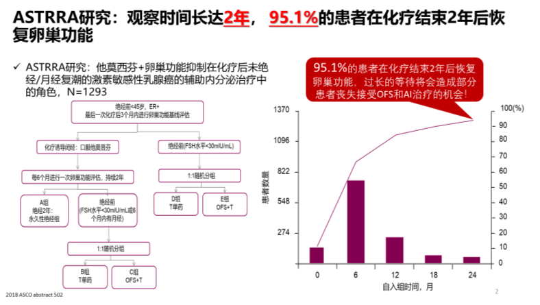 2018ASCO上报道了韩国开展的ASTRRA研究,这一亚洲人群的数据,或许可以给我们中国这部分患者化疗所致绝经比例一些启示。ASTRRA研究入组了1293例患者,其中一半以上是40-45岁患者。这些患者全部接受以AC为基础的标准化疗,发现化疗后,仅5.9%的患者在2年后仍处于闭经状态,超过90%的患者卵巢功能恢复。