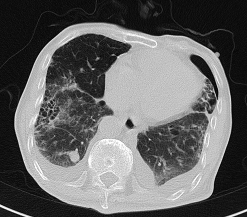 2020-01-08查胸部CT:双肺间质纤维化伴双肺气肿,双肺炎症,伴支气管扩张,右肺上叶结节样影,性质待定,双侧胸腔积液,纵膈多发肿大淋巴结,主动脉及冠状动脉硬化。