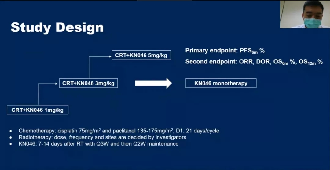 方法:本研究纳入6个月之内未接受CRT治疗或其他全身治疗的复发或转移性ESCC患者,接受姑息CRT治疗,包括顺铂(75 mg/m2 IV Q3W4~6周期),紫杉醇(135~175 mg/m2 IV Q3W4~6周期)和放疗(SBRT、常规和研究者根据研究中心剂量标准确定的剂量)。放射治疗(RT)结束后7~14天内,配合化疗同时加入KN046,根据1、3、5 mg/kg Q3W的上升剂量给药,随后KN046 Q2W维持治疗。KN046第一个治疗周期评估剂量限制毒性(DLT)。根据RECIST1.1,第一年每6周评估一次抗肿瘤效果,之后每12周评估一次。