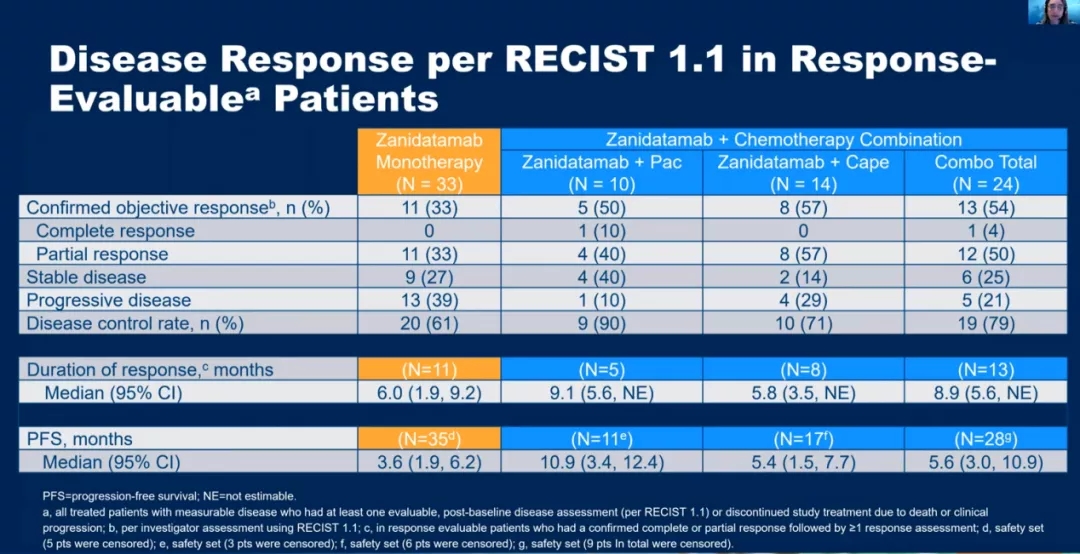 不良事件(AEs)方面,单药治疗的耐受性很好,主要是1级、2级副作用,最常见的为腹泻(这在医学上是可控的)或输液相关的反应(通常仅限于第一次输液)。如所预期,不良事件在联合化疗中更常见。3级或3级以上事件发生率在联合紫杉醇组和联合卡培他滨组中分别为64%和12%。严重AEs有3例:单药治疗组1例腹泻(3级AEs),zanidatamab+紫杉醇组有1例肺炎(5级AEs),zanidatamab+卡培他滨组有1例肌酐升高(2级AEs)