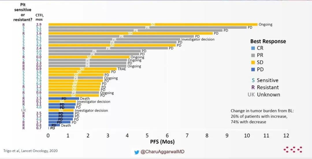 一线治疗开始后<6个月复发的SCLC患者:二线治疗有一整套药物方案可以考虑,其中拓扑替康在海鞘素衍生物Lurbinectedin之前获FDA批准。一项II期研究在105例SCLC患者中评估了Lurbinectedin(3.2 mg/m2每3周)的疗效,客观缓解率(ORR)为35.2%,中位OS为9.3个月,在铂敏感(45%)和铂耐药(22%)患者中均出现疾病缓解 (图4)。13“尽管拓扑替康治疗有效,考虑到毒性和骨髓抑制问题,拓扑替康不是我更喜欢使用的方案”,Aggarwal博士说,在二线治疗中,Lurbinectedin的缓解率和中位OS比拓扑替康更优。