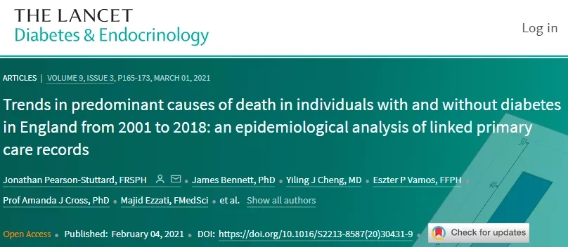 今年2月发表在《柳叶刀·糖尿病与内分泌学》杂志上的一项新的初级保健数据库分析显示,与非糖尿病患者相比,糖尿病患者的血管疾病死亡下降效果更好。伦敦帝国理工学院Jonathan Pearson-Stuttard等人分析了2001~2018年期间313907名成人糖尿病患者的数据。从2001年到2018年,糖尿病患者中男性总死亡率下降了32%,女性下降了31%,非糖尿病患者的总死亡率也有类似的趋势——分别为41%和33%。
